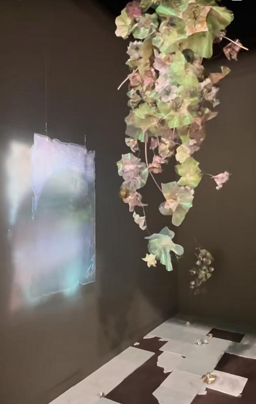 而在與畫廊相鄰的空間中,她復制了相同的展位,但三聯畫被馬賽克遮擋,這或許也是對數字圖像復制放大的一種象征。在這個展位的頂部,是下層展位的鏡像,但“美麗家園”已經變成了雜草叢生、長滿霉菌,畫作也難以辨認。在這樣的復制循環中,藝術家向觀眾展示了商品社會的正熵之旅。