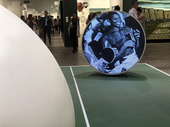 另一件引發觀眾共鳴的雕塑裝置作品來自新加坡藝術家黃漢明,他以20世紀70年代中美的“乒乓外交”為靈感,探討了體育文化在全球外交中的作用。
