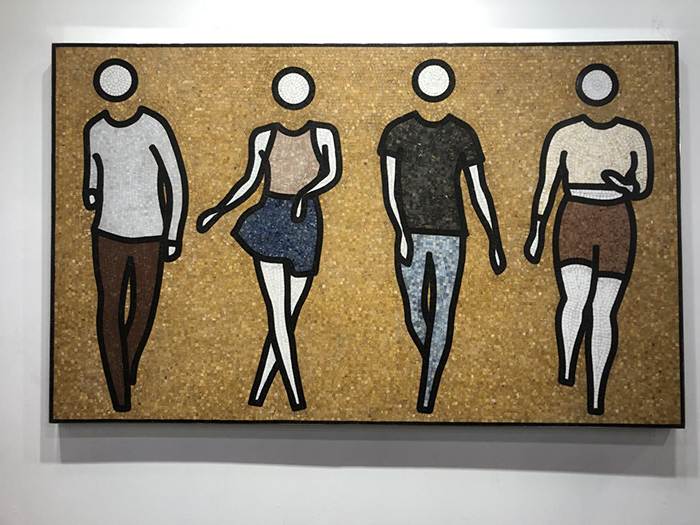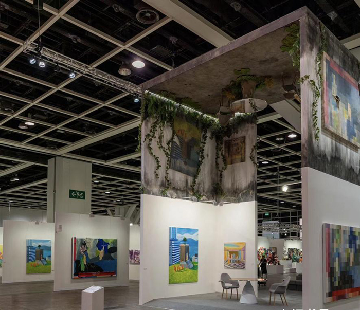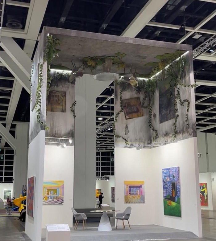 麥影彤二(MAK2)是一位幽默風趣的香港本土藝術家,她的作品反映了當今社會中真假難辨的問題。在畫廊展位上,她展出了名為《美好家園》的三聯畫系列,通過運用電子游戲《模擬人生》中的圖像,并分別委托三位不同的畫家進行繪制,再將三部分圖像拼合在一起,形成了數字圖像的模擬復制環節。