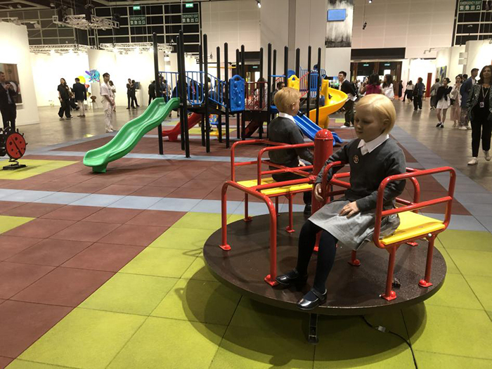 中國藝術家黎薇的作品《很久很久以前》展現了六個七歲的“超級政客”的形象。盡管是孩子,但他們沒有絲毫的童真,穿著整齊地擺放在游樂場上。觀眾一進入這個類似香港本地游樂園的場地,就會被突然發出的“鳥鳴”聲所嚇到。