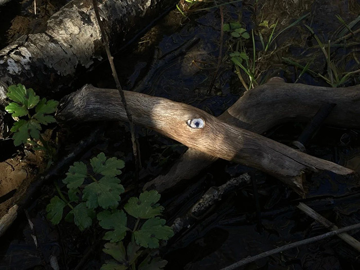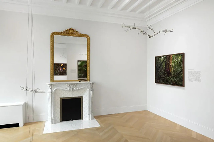 一系列攝影作品是此次展覽的核心。作品中出現在樹枝上的狗的眼睛,不僅成為樹枝的一部分,也成為景觀的一部分,強調了相互轉化的凝視以及看與被看的關系。展覽延續了藝術家對生物與其周遭環境之間復雜關系的探索,藝術家借助攝影和電影等媒介,并使用精心改良的有機材料,如樹葉、嫩枝或水果等,以詩意的方式惟妙惟肖地描繪了生動且富有靈性的自然。