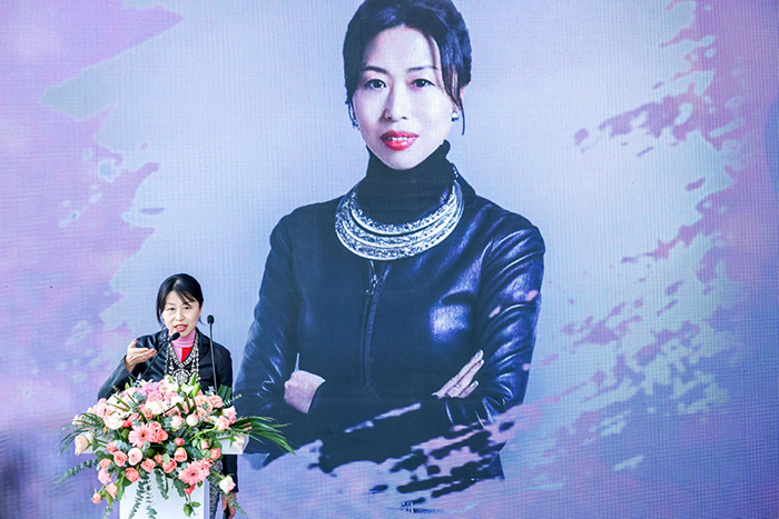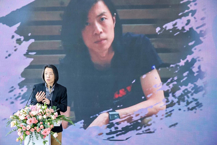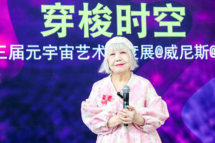 《穿梭時空》第三屆元宇宙藝術年度展@威尼斯策展人陸蓉之在新聞發布會現場發言。圖片由主辦方提供