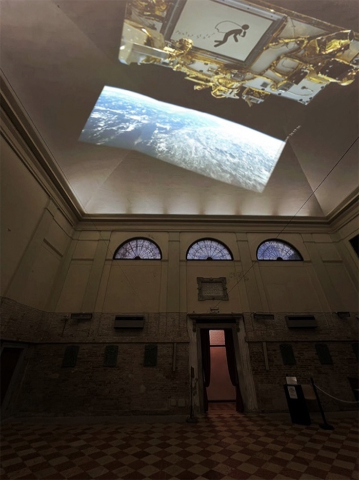 此次展覽將世界上第一部拍攝于外太空的定格動畫《衛星上的湖泊》,呈現在教堂禮拜堂的天頂上。這部3分7秒的短片是利用一顆退役在軌衛星“瓢蟲一號”拍攝。展覽中的作品借助火箭、衛星等太空科技,從更廣闊的視角,追尋了一個從古延續至今的愿望,呼應了圣塔 · 維內蘭達教堂上雕刻的銘文“給意大利乃至全世界帶來光明與和平(all italia al mundo implore luce pace)。