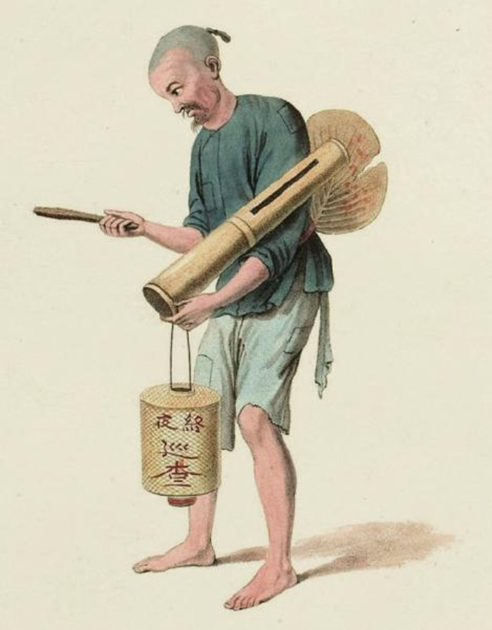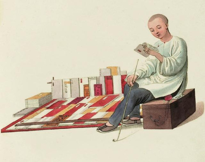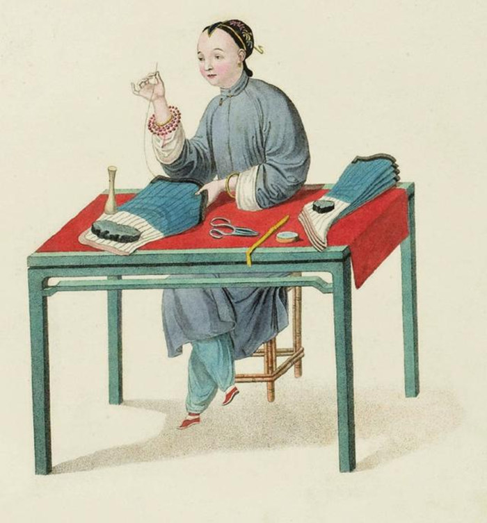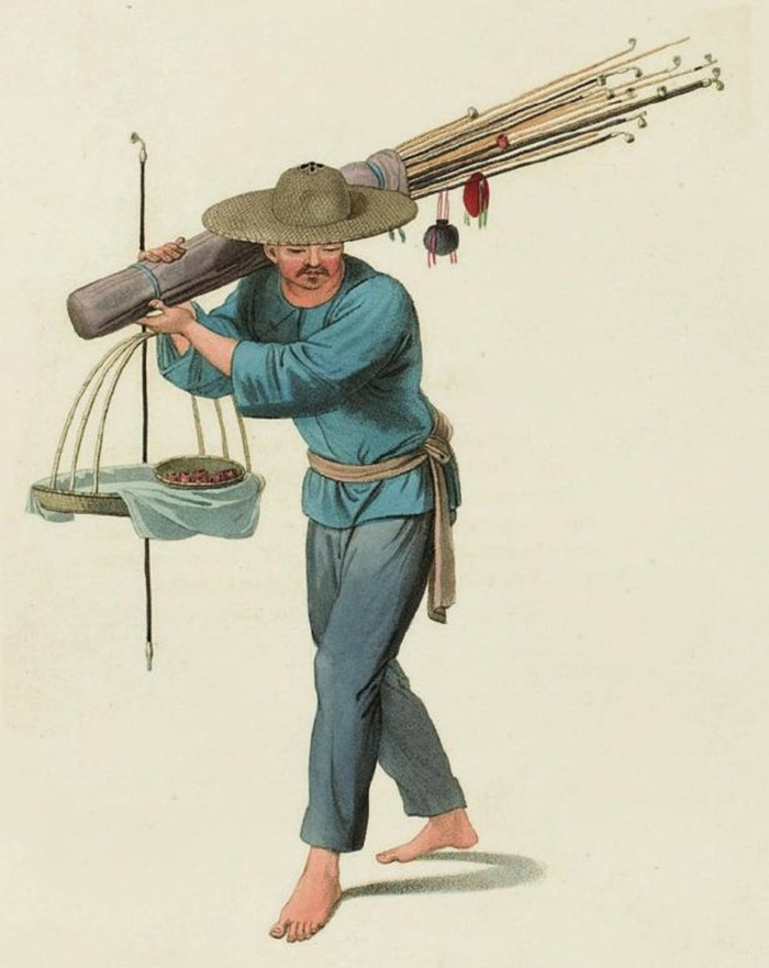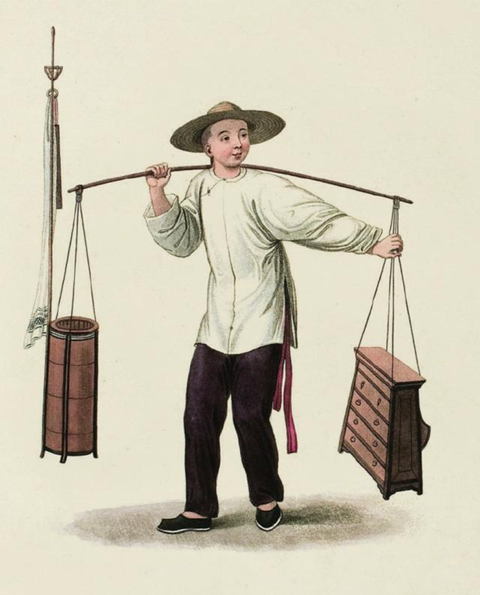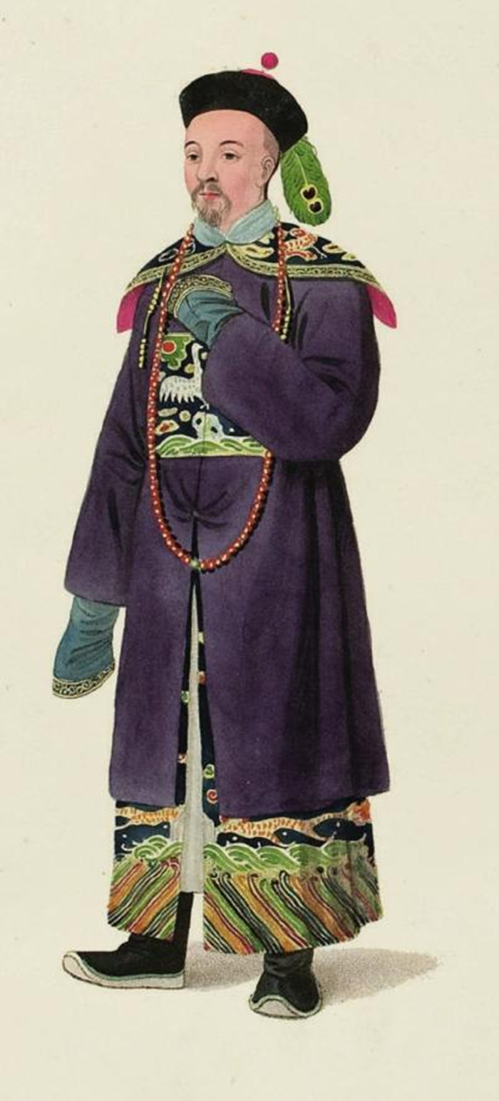 《中國服飾》1800年在倫敦用英文和法文出版,內有60幅整頁彩色插圖,系統再現了清代社會日常生產生活中人們的服飾裝扮,囊括了官吏、貴婦、商販、手工業者等各階層各行當。書中每幅插圖的左側都標有“Pu Qua, Canton, Delin”字樣?!癙u Qua”即為“蒲呱”,“Canton”是廣州,而“Delin”指“德齡社”,為畫肆的名稱。