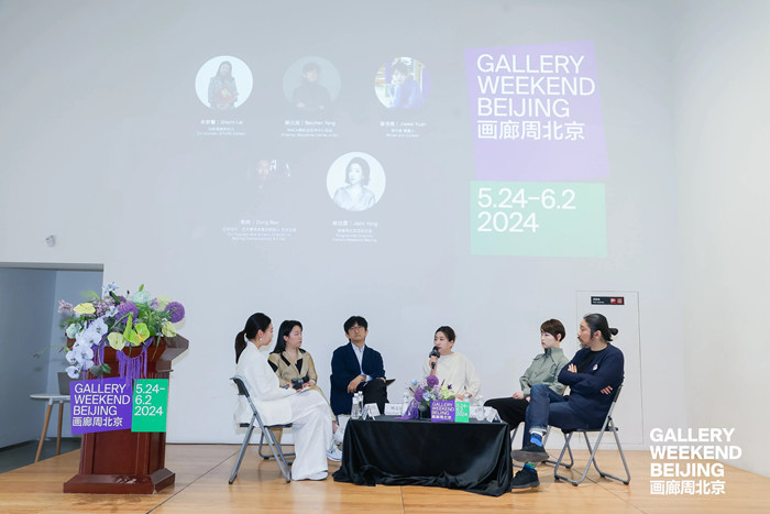 圓桌論壇環節中,馬刺畫廊合伙人來夢馨(Sherry Lai)、MACA美凱龍藝術中心總監楊北辰、新勢力單元策展人袁佳維、北京當代·藝術博覽會聯合創始人鮑棟及畫廊周北京項目總監楊佳霖共同圍繞第八屆畫廊周北京的主題與變化、當下北京生態藝術圈面臨的機遇與挑戰、中國藝術生態的未來等問題展開討論。(圖片由主辦方提供)