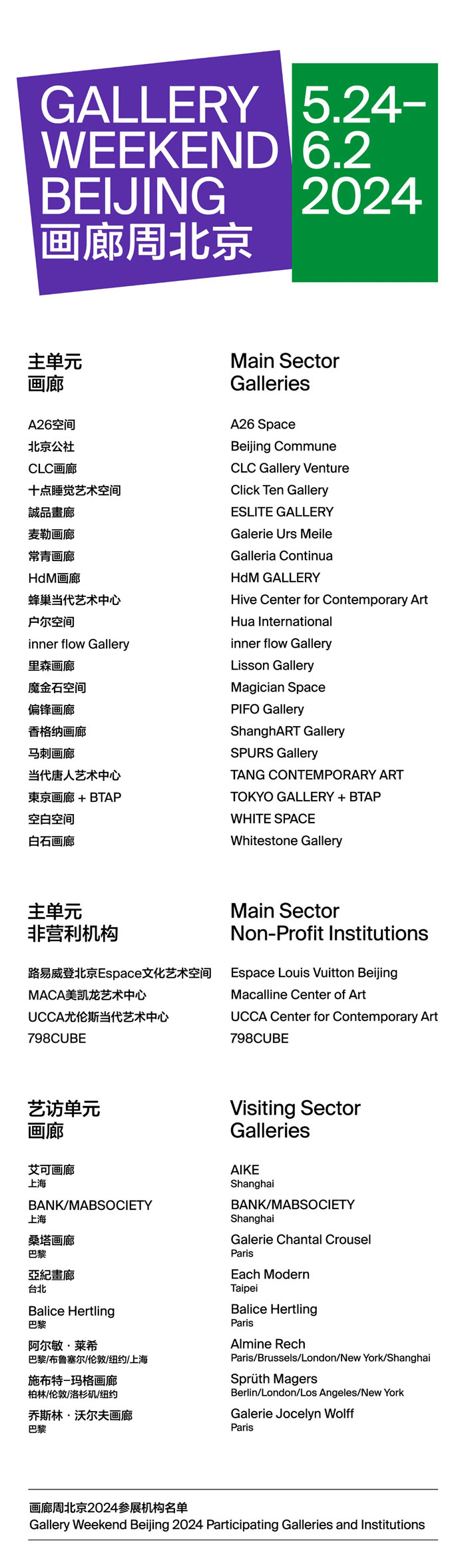2024年,第八屆畫廊周北京舉辦日期正式定檔于5月24日至6月2日。其中,5月24日至26日為貴賓日,5月28日至6月2日為公眾日。通過發揮畫廊周北京作為平臺的優質凝聚力,本屆活動將延續其內核與目標,聯動以798藝術區為中心的多處文化地標,草場地藝術區、順義藝術區等主要本土藝術區,及全國農業展覽館、CBD藝術區等核心點位,致力于突出北京作為當代藝術重要城市的多元風采。經由第八屆學術委員會評選,截至目前,共計有30余家國內外畫廊和非營利機構確認參與。