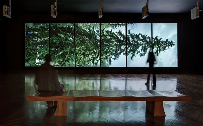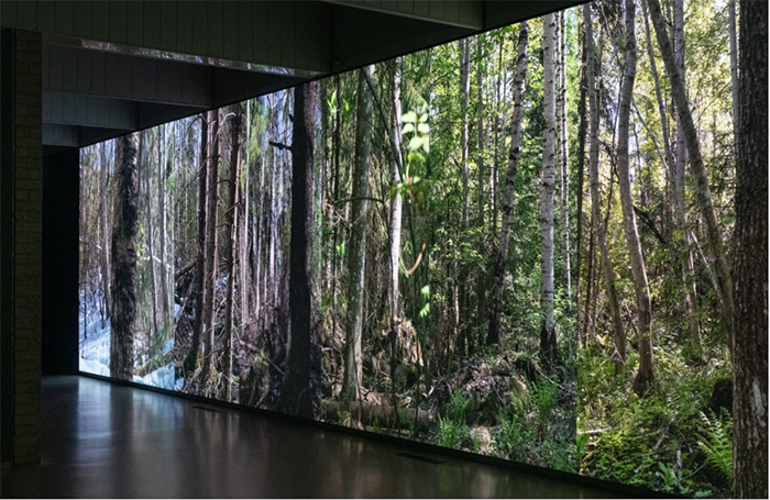 麗莎·阿提拉 (Eija-Liisa Ahtila)是一位芬蘭媒體藝術家。她的動態影像裝置探索了動態圖像中生態敘事的可能性,以及從將人類為中心的世界觀移出的可能性,讓觀眾體驗超越和脆弱,敬畏自然,理性面對損失的復雜情感?!端脑隆肥窃?022年和2023年的春天拍攝的,覆蓋了從冬季到夏季的過渡,通過八個通道接近森林的空間和軌跡?!端健肥且徊恳曰铙w云杉為主題的六頻道動態影像作品。作品完整地展示了這棵巨樹的存在,就像一具倒伏的鯨魚。觀眾能近距離地感受到云杉這一有機體的生命力的存在,每一幀畫面上都展示了云杉枝葉的隨風搖曳,仿佛動物身體的呼吸起伏一般。