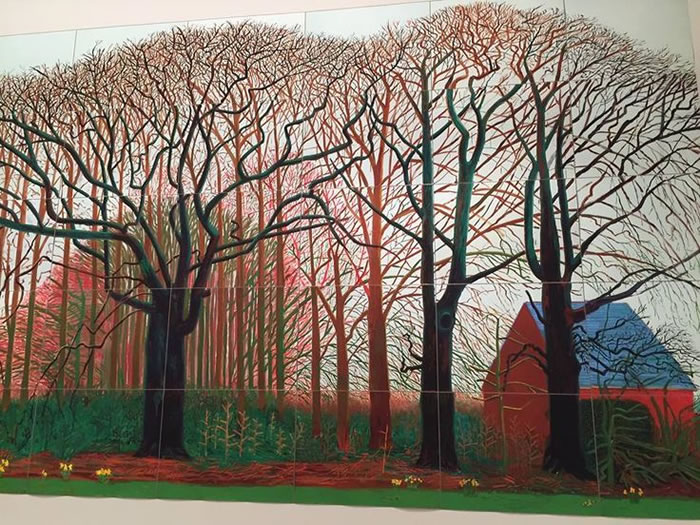 霍克尼以孩子般純真視野觀察自然,將修拉的點畫、梵高和馬蒂斯的活潑條紋,波普藝術的艷麗,中國傳統繪畫中的移動視點等以往的繪畫觀念和技法融通簡化,以令人驚訝的單純方式來表現樹枝、樹葉、樹簇的細節,呈現出一種既有秩序又豐富迷人的自然景觀。
