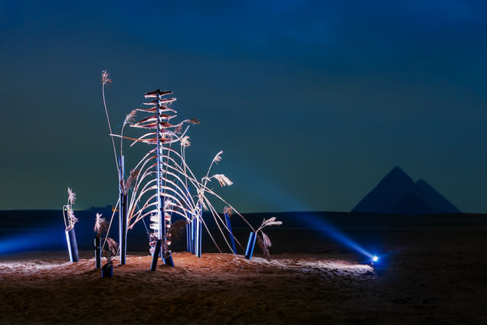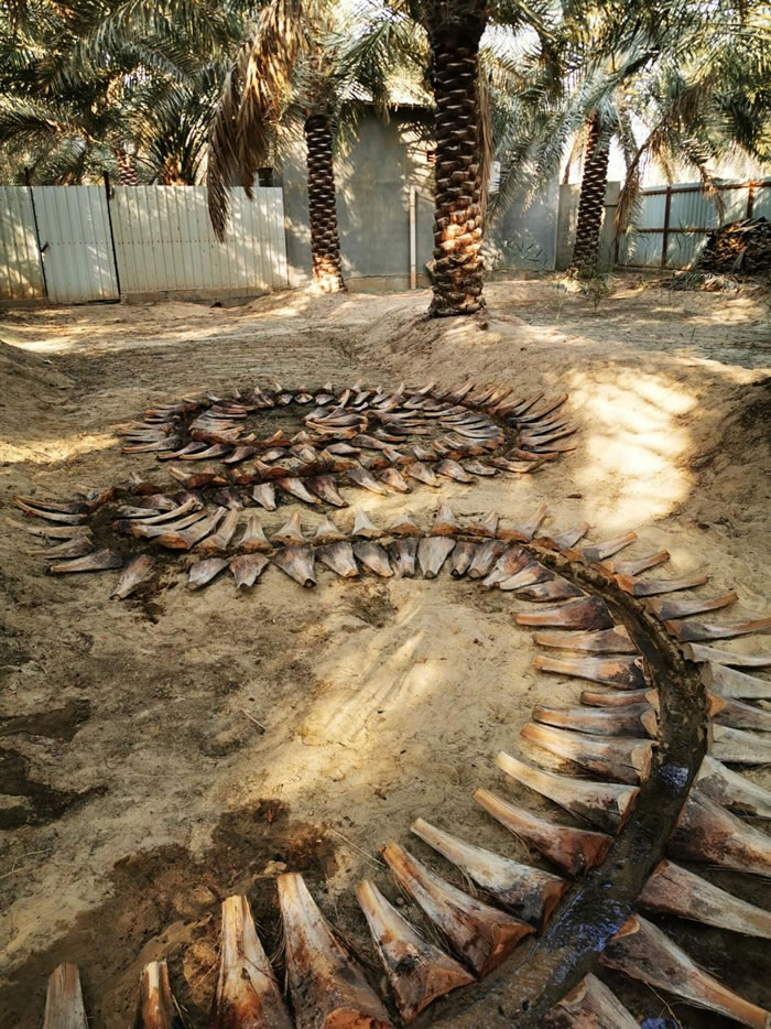 穆罕默德·阿爾法拉杰 (Mohammad Alfaraj) 是一位多學科藝術家。他認為:“親密感植根于一個人與自然環境的關系?!彼募亦l在阿爾哈薩,那是一塊沙漠中的綠洲,阿爾法拉吉從人們對自然的依賴中汲取靈感,為遇到的場景和生物賦予新的形式。他經常使用在當地的天然材料;例如泥土、棕櫚葉和棗子。藝術家將這些材料與居住在同一景觀中的人們的實踐相結合,例如在“知識化石”系列中,他用棕櫚樹死去的、丟棄的的部分組合成一個類似骷髏化石的生物。作品提醒人類可能不必拋棄過去的一切——比如祖傳的知識,可以幫助人類更清晰、更自信地前進。