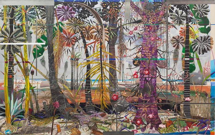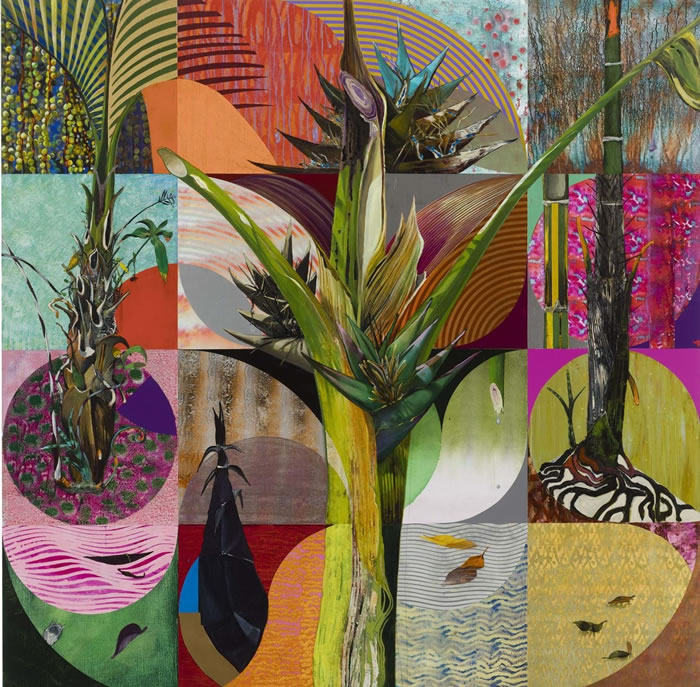 巴西藝術家路易斯·皮埃爾·澤爾比尼(Luiz Zerbini)致力于獨特版畫的創作。他擅長將城市景觀、巴西文化和熱帶植物茂盛的自然風光以豐富的色彩展現出來。他根據輪廓、形狀和紋理挑選和收集的葉子、花朵和樹枝被放置在預先涂上墨水的金屬板上,當通過印刷機時,藝術家想象的構圖被轉移到紙張上,從而在具象和抽象之間展現出令人驚嘆的形狀和顏色。2019 年,澤比尼參加了巴黎卡地亞基金會的群展《樹木》 ,藝術家的作品成為室內城市叢林的一部分,通過安裝真人大小的植物標本室強調了巴西現代性的意象。