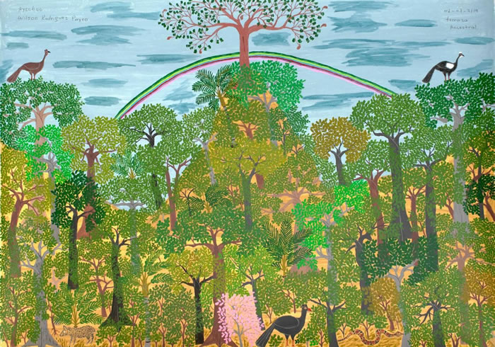 Aycoobo是一位土著藝術家,他描繪了哥倫比亞亞馬遜叢林中奇異多姿的樹,也包含從農屋創作故事到亞馬遜季節變化中的各種內容,這些作品基于他在神圣植物儀式中所經歷的感受、靈感和觀察。他的藝術實踐涵蓋了人類與無形世界之間的關系以及利用藥用植物來擴展感知,展示了自然物種之間的相互聯系,精神世界充滿活力和驚奇感。Aycoobo一生都在接受祖先的知識,尊重前幾代人教誨的一種方式:我們如何與我們的前人建立聯系?知識的傳播如何在人類和非人類世界中傳播,特別是在殖民定居威脅到土著認知和存在方式的地方?