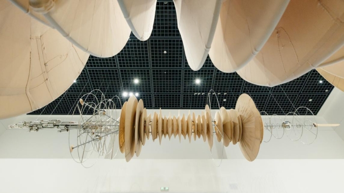 “一刻·出入”宋冬、尹秀珍雙個展由一件形似“旋轉木馬”的裝置開啟,《每個人都是太陽》作為二人的合作作品,位于展館一樓中軸線上,也成為本次展覽最受歡迎的打卡地之一。這件形似“旋轉木馬”的裝置中間懸掛著著多個高低錯落的大小圓球,置身于其間仿佛有種身處在無界宇宙中的錯覺,值得一提的是作為裝置中心的木質旋轉軸是由藝術家從各處收集而來的舊門窗制作而成。