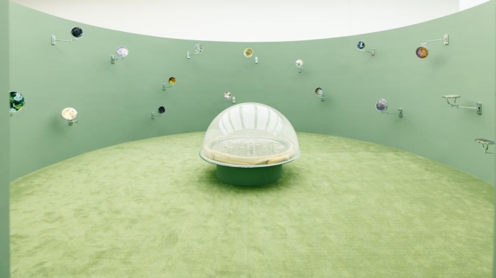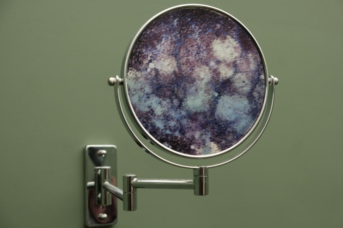 尹秀珍新作《微宇宙》與藝術家本人的生活經歷有關,她將目光放在了生活中因長時間靜置而干癟腐爛壞掉的事物,藝術家將這些發霉的東西拍照放在鏡子上,又將鏡子處理為一面正常、一面放大的形式,觀眾在觀展的過程中可以撥動鏡子進行觀察。值得一提的是地面上還放置了一件形似蒼穹的裝置,內里也存在一些小苔蘚,尹秀珍在接受采訪時表示這一裝置其實是形成于布展期間——工作人員休息時喝剩下的茶水倒在上面,干枯的茶葉沾染以后形成的這一發毛現象。