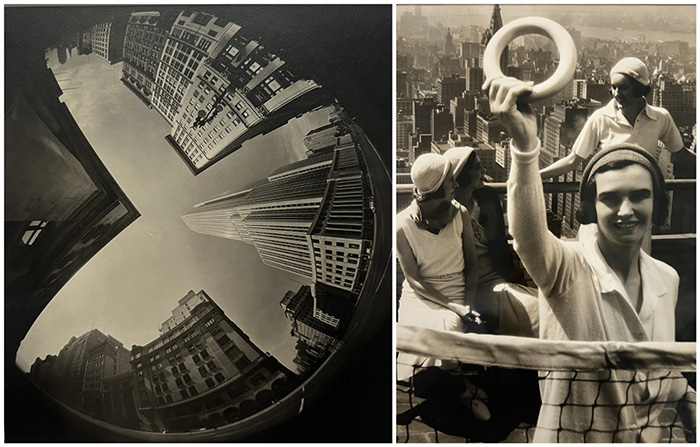 左圖:魚眼鏡頭中的紐約帝國大廈,攝 /拉爾夫·史坦納(Ralph Steiner,1899-1986,美國第一代前衛電影制作人及攝影師),1935;右圖:天臺上的網球手與曼哈頓天際線,攝 /瑪格麗特·布爾克-懷特(Margaret Bourke-White,1904-1971),1931
