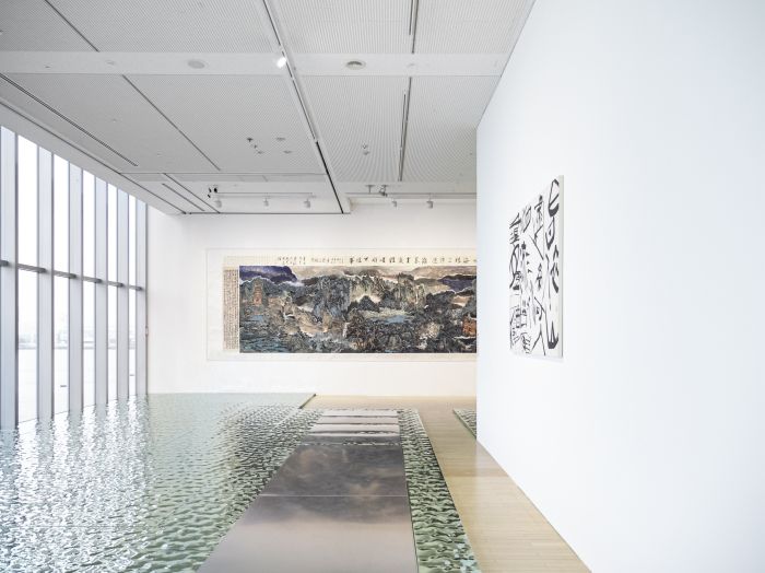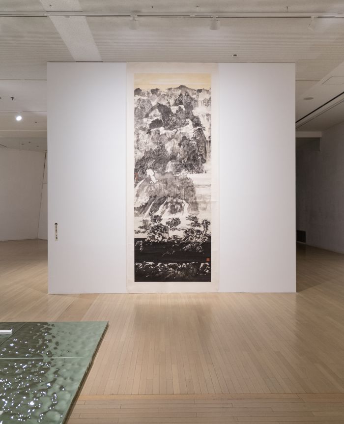 卓鶴君先生的作品《泉高入夢喧》在展廳中呈現為一件丈二的頂天立地畫作。我跟卓先生的家人講,作品不需要任何裝裱,就以大頭釘釘在展墻上,如一練瀑布飛流而下。這樣的展出方式,對于傳統書畫來講一定不是正常的展陳方式,但是我們邀請的藝術家們,在理解了整個展覽方案之后,都抱有非常開放的態度,愿意配合展覽的呈現。