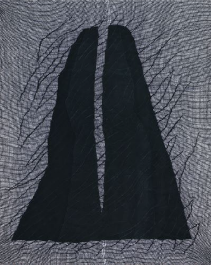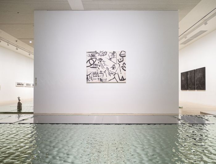 展場入口設計成了狹窄的入口,走進去面向展廳,左側即是“海上求仙客,三山望幾時”,右側是日本具體派代表人物前川強的綜合繪畫。前川強的作品作為展覽的引子,寓意開門見山。這座山乍眼看是非常靜的,再看卻充滿動勢,麻布的紋理清晰可見,畫面中間如劈了一刀,有“兩岸青山相對出”的視角。
