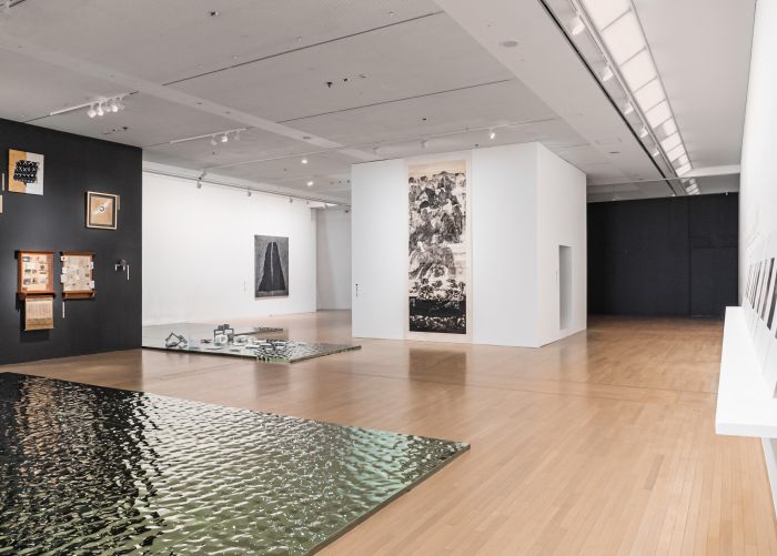 此外,展廳還做了三處墻體搭建,隱喻漂浮在“海面”之上的三座仙山;整個展覽現場構筑了“三山三境”的節奏,并綜合運用了光線營造了三種視覺意象:靠近海面的部分采用室外光,明亮寬闊,觀眾也會覺得心境開闊;中間部分則采用室內白光,形成三山合圍的對話;最后是一個內觀的區域,采用了暖色燈光,空間較暗,營造出一種關照內心的親密氛圍,引導觀眾進入內心深處的思考。展覽的節奏不僅實現了對“三山三境”的隱喻表達,更是拉出了中國傳統中國畫的三種視角——平遠、高遠、深遠。