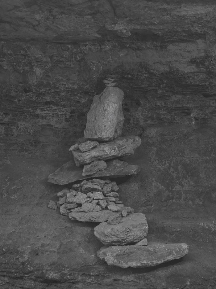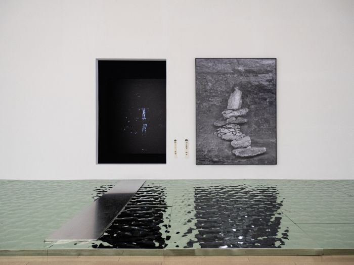 蔣斐然:策展團隊希望每件作品都能夠有所呼應,互相串連,在展覽現場形成連貫的敘述。盡管作品媒介形態各異,但相互呼應、對話,共同營造了一個相互貫通的現場。比如我們能看到其中一座仙山其實是一個洞天。在洞的入口處,一掛瀑布流下來。展陳方式借鑒了日式園林的造景手法,展出了林舒的攝影作品《鴆》,以黑色燈箱嵌入墻壁的展出方式,微弱的燈光打到作品上,影影綽綽能夠看到瀑布部分是光亮的,讓人仿佛置身于真實的洞天之中。而緊挨著這個洞口的,是另一個與該洞口完全等大的洞,只不過它是攝影作品——藝術家塔可的攝影作品《洞中觀音2》,拍攝內容是洞天中民間用石頭壘起來的觀音。這件作品不僅與林舒的洞天一左一右,有如一虛一實的兩個洞天相互呼應,同時也與洞外杉山功的《神居》系列雕塑作品構成形式上的互文,因為它們都同樣處理了堆疊石頭的作品形態。