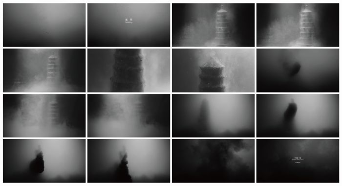 再舉一例,“塔”是在展廳中反復出現的視覺意象。比如在展廳的最后一個區域,一座仙山內部展出了管懷賓老師的影像作品《流隙》,影像內容是一座塔在水中慢慢消融的過程,極具禪宗意味。而與這件作品形成互補與對話關系的,是梁琛的《無止境塔》?!稛o止境塔》是一件新媒體燈光裝置,這座塔不斷螺旋式滾動、上升,指向的或許是一種當代的巴別塔,隱喻人類永遠向上求索,生生不息,向宇宙探尋的欲望;塔內的燈光照射到墻壁上,令人想到柏拉圖的洞穴隱喻,映照出幻象的現實。梁琛的“塔”突破了我們對佛塔的傳統意象,塔作為一種精神象征物,也代表著人類探索宇宙的野心,古代的人們望塔通天,今天的我們依然在通天的道路上沒有停止過。這件不同形式的塔,無論是在媒介含義還是在精神內涵上,都給展覽疊加了另一個維度的解讀。