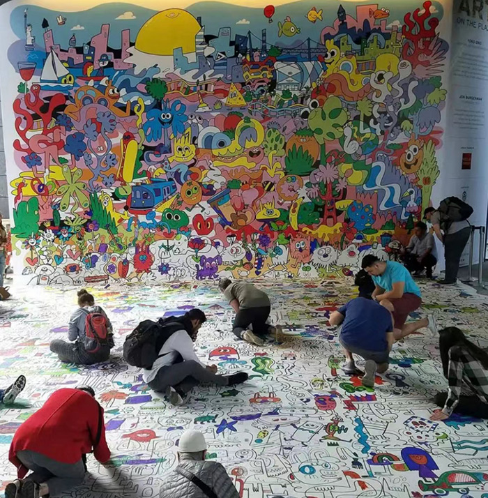 Jon Burgerman的創作過程往往與觀眾的互動密切相關。他喜歡在公眾面前創作,這種即興的表現形式不僅增加了藝術作品的不確定性和原創性,也讓觀看者有機會近距離感受藝術創作的實時過程。藝術家曾于2018年受策展機構 Culture Corps邀請,在紐約曼哈頓哈德遜城開發項目的啟動活動中,與許多紐約市民共同用色彩填滿一副壁畫。此外,在一些公共藝術項目中,Burgerman會邀請路人參與到畫作的創作中來,這樣的參與和共創使得每一件作品都充滿了獨一無二的故事和意義。