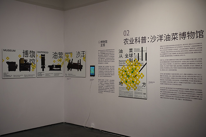 展覽中,左靖團隊的參展項目為“農業科普、地方設計與整村實踐”?!罢鍖嵺`”展示的是團隊在河南省修武縣大南坡村自2020年開展以來的建設成果,包括改造當地閑置公共建筑群、文化生產、產品生產及兒童美育等;“地方設計”呈現了為湖北省荊門市全新設計的荊品名門·概念店和“源楚:荊門的物產、農耕和文化”的豐富內容;“農業科普”展示了改造后的荊門市沙洋油菜博物館,館內設有農業科普展覽“油菜:從全球到地方”的博物館主館、展示中國油菜科研領域杰出科學家工作與成果的文獻館,和集沙洋縣優質農產品的展示、體驗、銷售為一體的博物館商店。