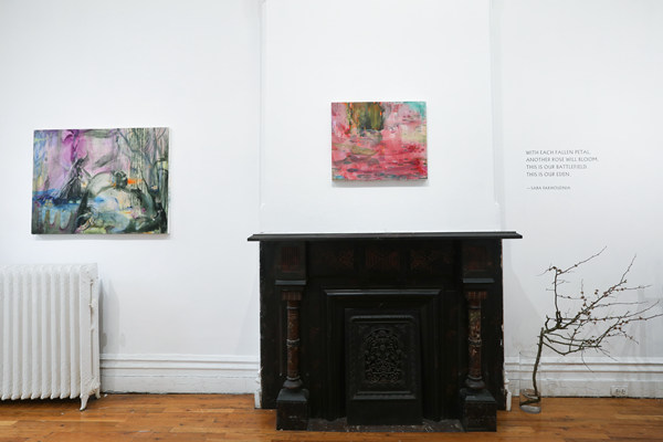 《她去藍玫瑰的橋》和《花瓣飄落,玫瑰佇立》在“薩巴·法霍德尼亞:花瓣飄落,玫瑰佇立”展覽現場” ?薩巴·法霍德尼亞,攝影:Ken Lee,致謝否畫廊