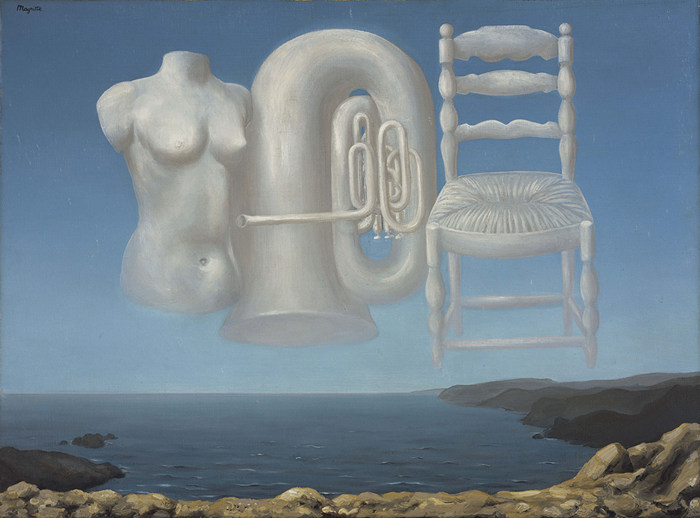 那個畫寫有“這不是一個煙斗”作品的馬格利特,無疑是機智而幽默的,他將尋常生活中的蘋果、酒瓶、靠背椅等物品形象,放置在與之無關聯的環境中,巧妙構思,別具新意。他的作品《魔鏡》仿佛是對當代社會觀者的映射,人們看向魔鏡,看到的會不會是真實的自己呢?正如馬格利特的名言:寫作是對思想的不可見的描述,而繪畫是可見的描述。