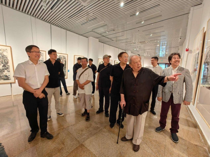 中央民族大學美術學院院長烏日切夫致歡迎詞,他首先向劉漢先生表達了崇高的敬意,并在講話中談到劉漢先生的作品大氣磅礴,線條變化萬千,極具視覺沖擊力,撐得起當代中國畫宏大而硬朗的畫面。先生雖已93歲高齡,但依舊保持著旺盛的創作熱情,筆耕不輟,這種對中華文化堅守與弘揚的精神深深影響著一代又一代的后學者,是我們學習的榜樣。