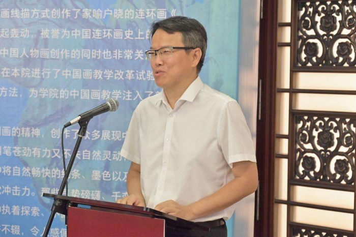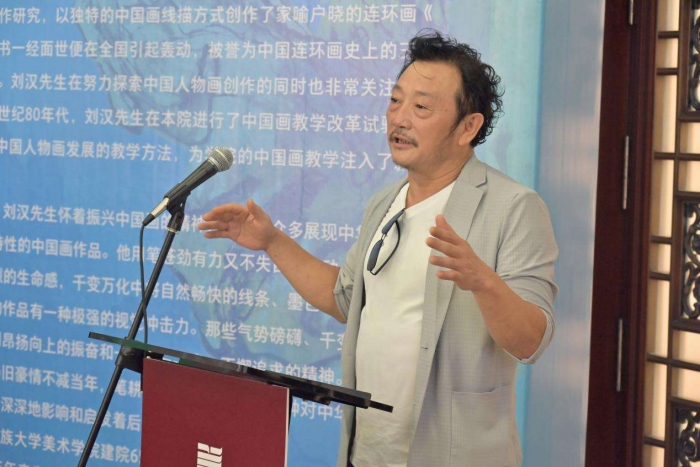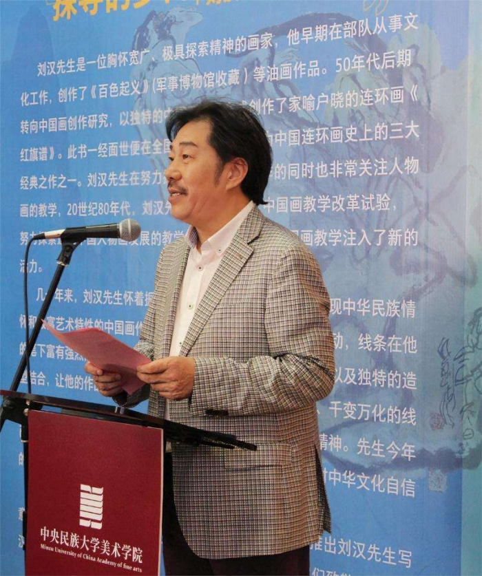 中央民族大學黨委常委、副校長石亞洲代表學校及全體師生對劉漢先生表示熱烈歡迎。他表示,劉漢先生從藝七十多年來懷著振興中國人物畫的夙愿,創作了眾多展現中華民族情懷和極富藝術特色的中國畫作品,這些作品所蘊含的寫意精神和現代性值得所有人學習。石亞洲副校長強調,在美術學院建院65年的歷程中,離不開眾多老師的貢獻,向為美術學院的發展做出貢獻的老一輩藝術家致敬,美術學院要在繼承傳統中將幾十年來的優良傳統傳承下去。