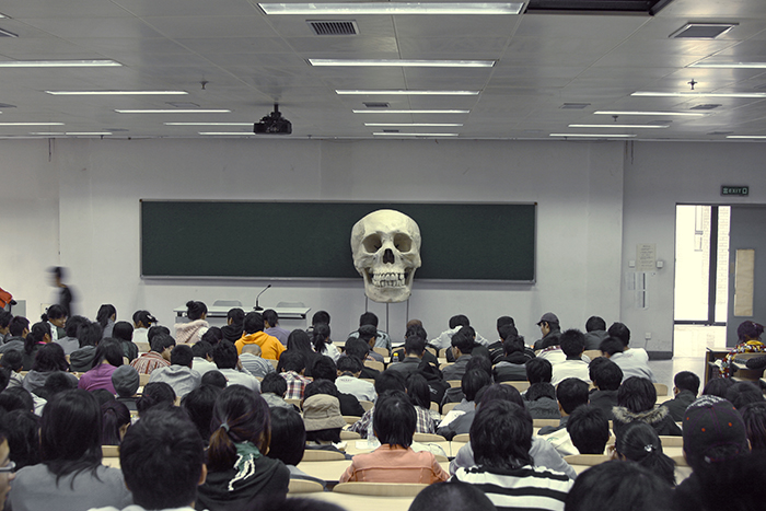 王旭 《大頭骨在滿是一年級學生的F109教室》 2008年 尺寸可變 樹脂、金屬、油性漆