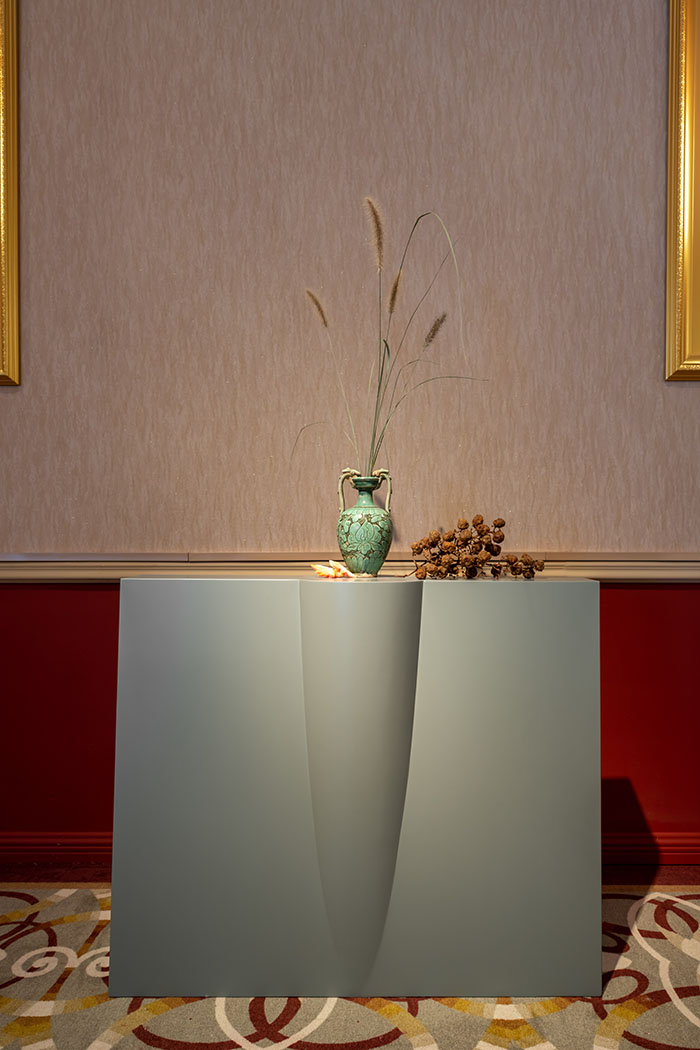 佩恩恩《衍生宴》中的《羅漢大宗(干制·素·佛跳墻)》 2023年 木質水閘:100 cm×30 cm×84 cm 宋磁州窯綠釉纏枝剃花雙龍尊瓶(仿)、楊桃(仿)、葡萄枝子、豆腐丸子、狼尾草