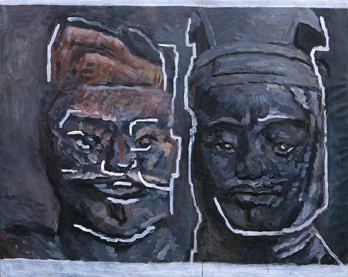對于余友涵的“兵馬俑系列”,馮原寫道:“余友涵筆下的俑,并非是在今天的世界文化遺產名錄中的兵馬俑——‘他們’是凝望‘今朝’的‘我們’之先祖,透過‘俑’之于我們的對視,我們從俑的面目和表情上看到了‘我們’?!?/p>