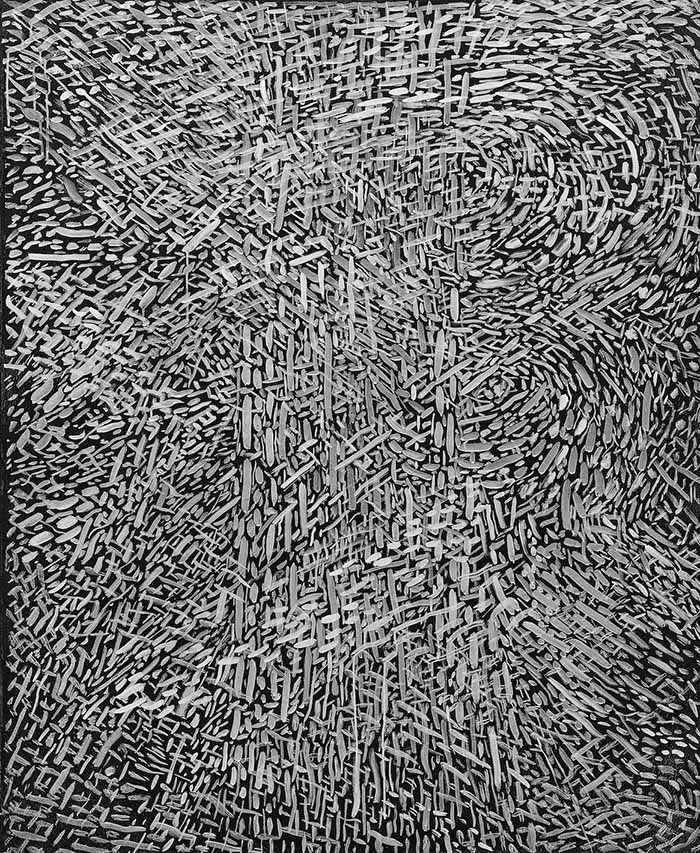 余友涵的《抽象1988-1》通過點與線的浮動、循環象征物質和精神世界的交織,體現了余友涵對宇宙運動自發和自由的理解。他表示:“我非常喜歡老子的基本觀點,因此也想讓畫面達到鮮活、靈動、永不停歇的效果?!?/p>