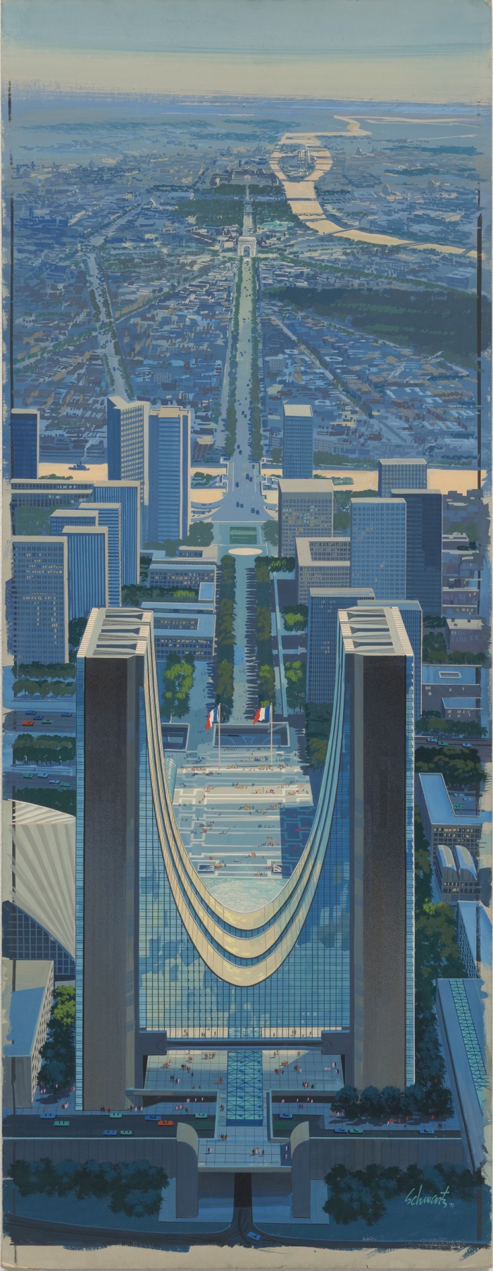 拉德芳斯之首(1970–1971,未建成)設計方案效果圖,巴黎 1971 年 蛋彩畫紙板本
