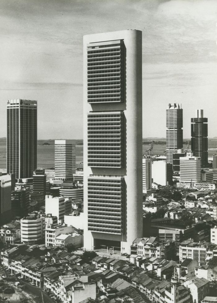 華僑銀行大廈(1970–1976)屹立于新加坡金融區摩天大樓之間 約 1976 年