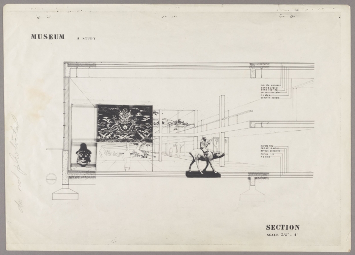 貝聿銘 哈佛大學設計學院建筑碩士論文中“上海中華藝術博物館”設計的剖面繪圖 1946 年