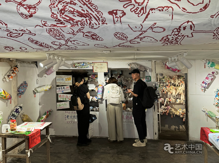 “糖果屋大賣場——老太太聯名計劃長物集藝”是一個有趣的藝術案例。此時糖果屋墻上掛著各色糖果禮包,奶奶們把藝術獎的榮譽證書高高地掛在窗口,手里不停地給購買的顧客打包結算。據“長物集藝”的負責人黃佳琦介紹,作品最早源于程必蘭、黎永香等素人繪畫,她考慮到將這些繪畫進行銷售,為老人們帶來切實的收入。