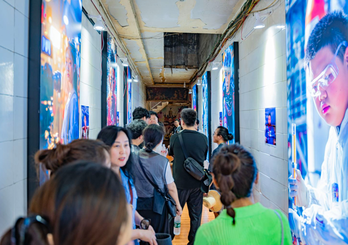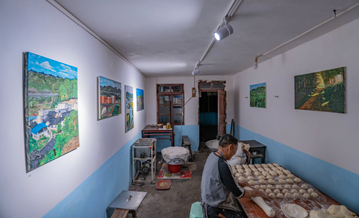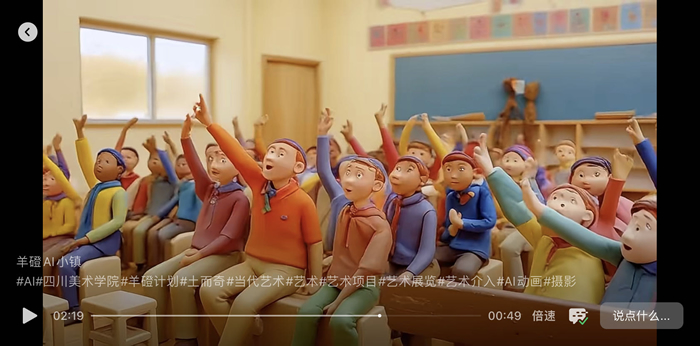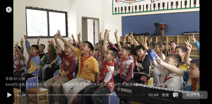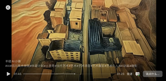 在很多人眼中,AI人工智能與鄉村風馬牛不相及,但羊磴鎮的孩子與AI參與的《人人都是AI藝術家》成為了藝術鄉場的另一個亮點。嘉賓們擁擠在二姐早餐店狹窄的通道,凝神觀看AI生成的羊磴孩子們的影像,在里間播放的視頻《羊磴AI小鎮》借用AI視頻技術,疊合出奇幻的藝術史經典造型,將羊磴人日常生活與對未來的夢想表現的亦真亦幻。作品在去年抖音年度話題“人人都是AI藝術家”播放量短時間達到133億次。