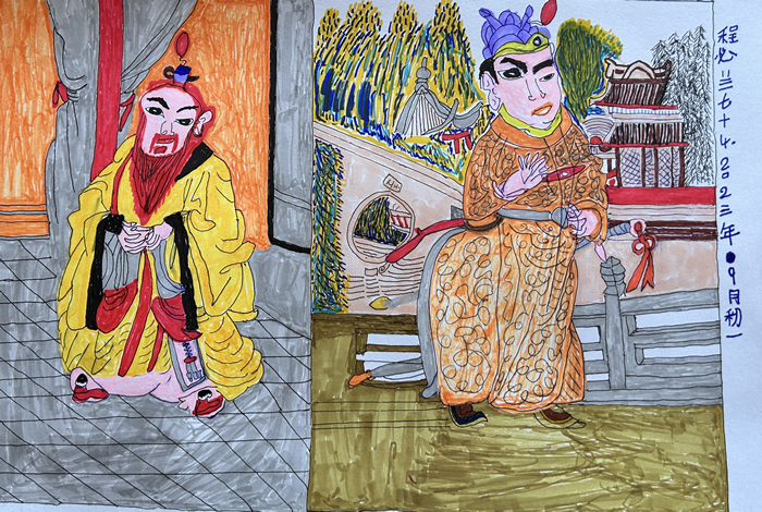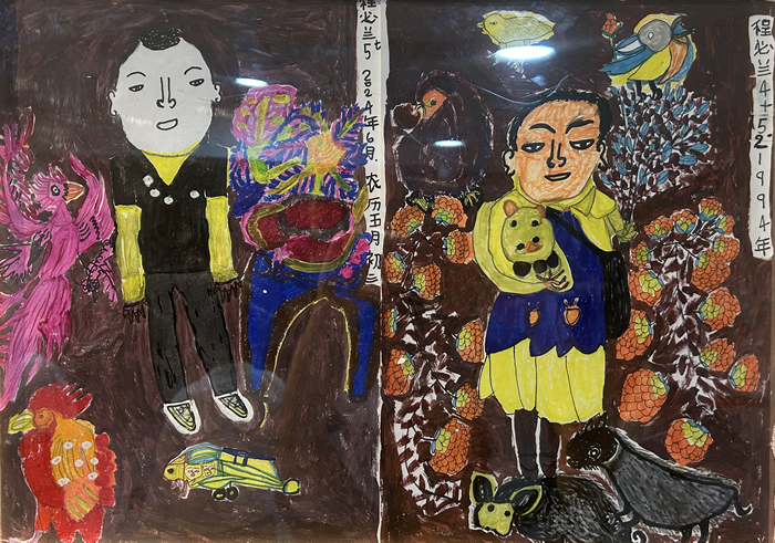 獲得第二屆羊磴”土而奇“藝術鄉場藝術大獎的程必蘭已經75歲高齡。她一生為家庭操勞,疫情期間她有了一些閑暇時間,開始撿起畫筆在紙上自由地畫起來。她的孫子畢業于貴大藝術學院,有一次回家,發現奶奶的畫有一種與生俱來的控制力和敘事邏輯,她能將身邊最日常的生活場景轉化為富于想象力的鮮活畫面。受到孫兒鼓勵的程必蘭對畫畫更加喜愛,她的畫也得到了周邊更多人的認可。