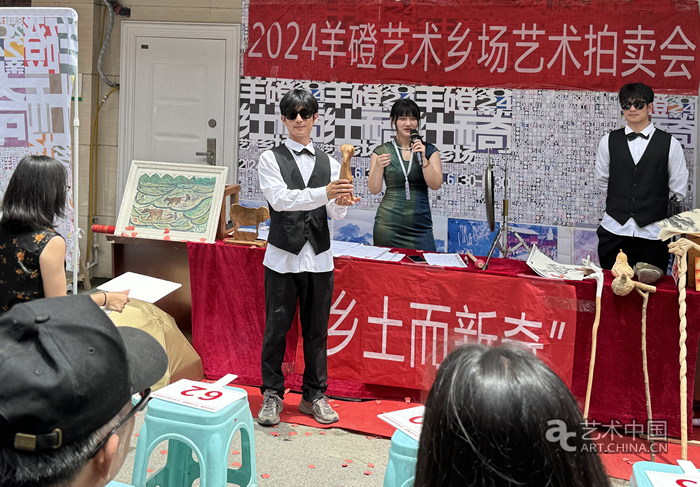 “2024羊磴藝術鄉場藝術拍賣會”吸引了眾多人的目光。兩位身著禮服的男青年手持木雕或繪畫,拍賣以一元價格起拍,一位女士手持拍賣錘主持競拍,最終“鏜”地一聲錘落銅鑼敲定,完全復現了拍賣行的情境。作品是川美老師張翔的創意,兩位青年是川美研究生,他們希望通過拍賣活動,將羊磴的素人藝術家作品進行銷售,所得款項扣除藝術家份額,剩余部分將捐贈給當地小學。