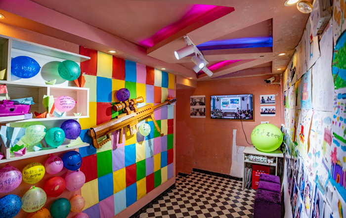 《麗都KTV》曾經是羊磴鎮一家廢棄的KTV,羊磴藝術協會保留了典型元素,經過重新設計形成了新的公共空間,并實施了馮于橋發起的農村女童保護問題的“女童計劃”的公共活動。這里狹窄的通道內布置的色彩曖昧的燈光和氣球對青少年進行了自我保護的警示提醒,孩子們在氣球上寫下了自己的感想。
