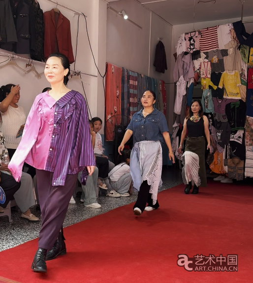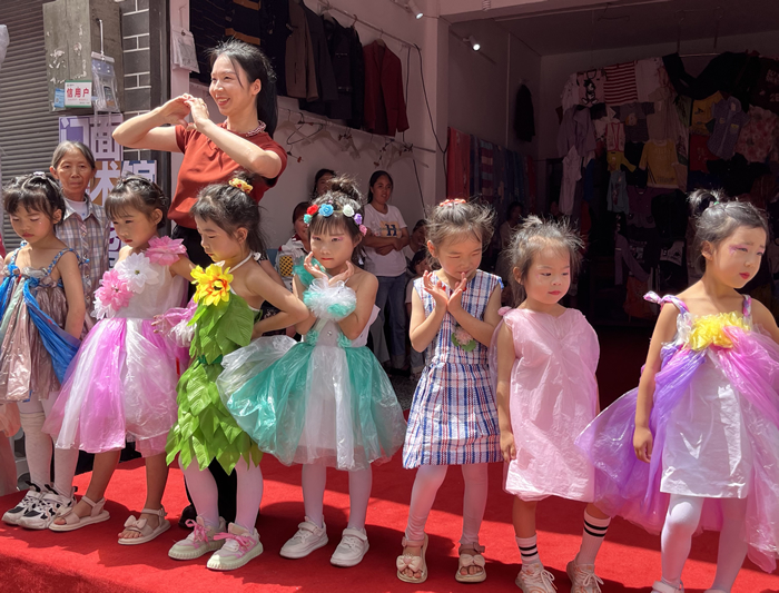在“老陳服裝店”的狹小空間內,幾位中年女性、一位帥氣的青年和幾位兒童身著潮流光鮮的服裝進行著T臺走秀。臨時演員大部分是當地中老年舞蹈隊成員,孩子們是當地幼兒園的小朋友。伴隨著強勁的音樂節點,他們像職業模特一樣,每一個步伐,每一個轉身都充滿自信。隨后小朋友還集體展示了用彩色塑料袋裁剪的服裝?!八麄兒茏孕藕艿?,服裝還在于搭配?!鼻迦A美院陳岸瑛教授對這項活動贊譽有加。