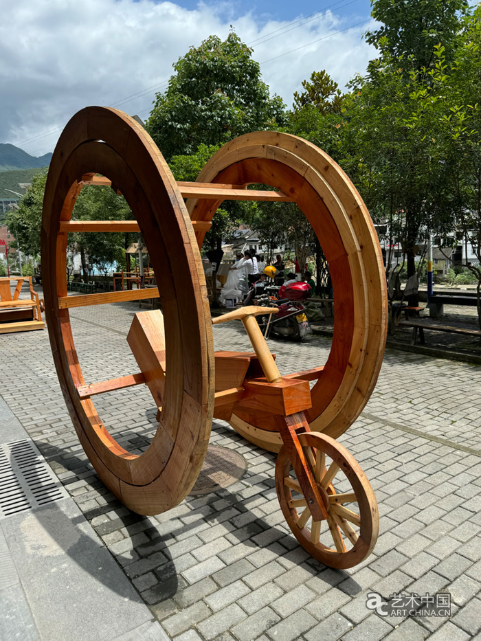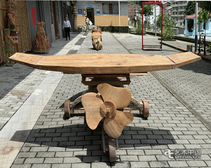 在“鄉土而新奇”藝術鄉場中,木雕作品占據很大比例。川美藝術家最初進入羊磴鎮,就是與當地木匠合作了一批木雕作品打開了局面。在羊磴藝術館展館門前,擺放著《老虎凳》《轎子》《貓窩》《飛機》等巨大奇特的木雕作品。藝術家毛鳳翔從小受到前輩們的耳濡目染,他善于將自己觀察到的生活中的趣味,以傳統木工技藝和現代雕刻相結合的手法打造出各種奇思妙想的木雕作品,贏得了近千萬粉絲的青睞。