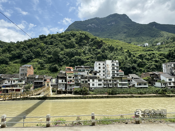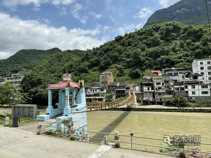 2024羊磴“鄉土而新奇”藝術鄉場的作品大致分布在新城區和老城區老街兩個地方。羊磴鋼絲橋橫跨在湍流不息的羊磴河上,聯接著老城區和新城區的日常往來。這座很“土而奇”的橋曾上演過很多藝術活動,之前也曾多次在洪水中損毀,后經羊磴藝術合作社與村民們共同修繕如今煥然一新。藝術節開幕前,銅鼓灘漂流公司的老板婁其林邀請專業團隊為橋頭堡涂上了彩繪。