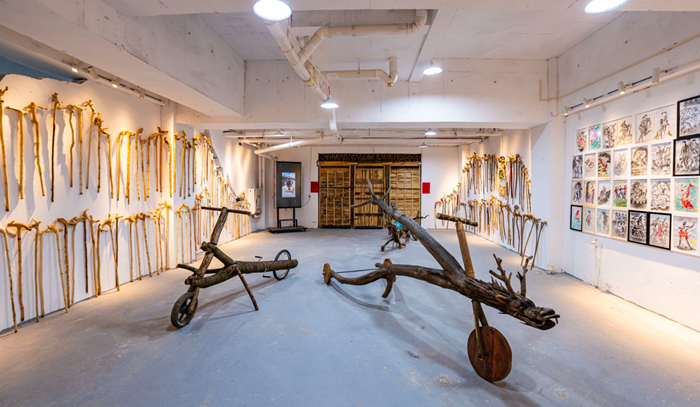 在藝術達人館展示著一些雕刻著龍身、鳥頭、蛇身等動物造型的拐杖,構思巧妙,趣味橫生。藝術家成克云獲得了本屆羊磴藝術鄉場“土而奇藝術作品獎”。成克云是一位奇人,他先后做過泥水工,拍過畢業照,養了快二十年的羊,也拍過抖音。23年上半年在養羊之余開始削拐杖,下半年就熟練掌握,居然掙到六千多元。