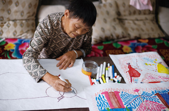羊磴藝術協會敏銳地捕捉到這一信息,在今年3月份發起了一個尋找“老藝人”的公告,鼓勵鎮上的女性55歲,男性60歲以上的老人到羊磴藝術館畫畫。這些退休老人比較寂寞,日常休閑主要是聊天打牌。藝術館為奶奶們提供了畫材,她們唯恐浪費了紙和筆,當慢慢地畫進去后,她們發現原本遙遠的藝術竟然如此有趣,有些老奶奶甚至進入了癡迷的狀態。
