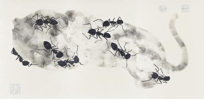 在本次展覽中,申暎浩特別創作了一幅4米長的水墨畫《游牧》(Nomad),畫中的"螞蟻"是他從 2017年早期的《游牧系列》中演變而來的獨特形象,通過螞蟻的有限視角對現代生活進行了反思。藝術家在接受采訪時提到,在中央美術學院研究書法的過程給他的這一系列創作帶來了很大的啟示,在畫面上制造螞蟻就像分解中國書法的筆劃一樣,作為元素和材料出現。在看過系列作品之后,我們發現也許重要的不是螞蟻,而是螞蟻攀附在睡虎、陶罐上的過程,重要的是螞蟻用身體感知的那個形象。