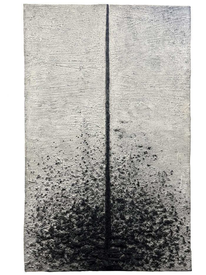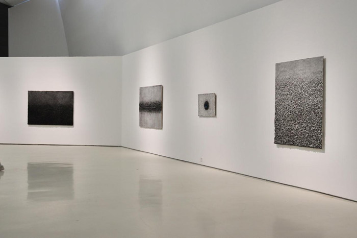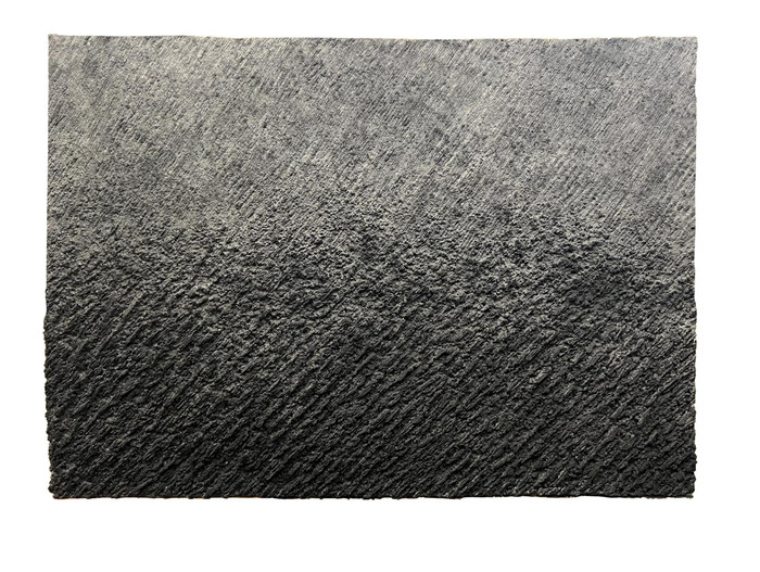 隨著時間的推移,韓紙和木炭逐漸變得厚重并完全融合,最終形成至少10層,有時多達20至30層的融合層,在表面上創造了粗糙而陡峭的浮雕,指涉出可能存在的內在景觀,在其上光影可能呈現出無限變化的色調和效果。李鎮雨的作品通過痕跡和擦除同樣喚起了空虛和存在的感覺,其寧靜的構圖植根于純粹的形式和煉金術的精神。