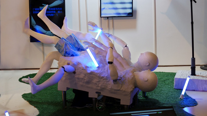 “且共肉身游戲”出自蘇軾《如夢令·自凈方能凈彼》。兩個搭載多模態大模型的機器人將觸碰、輕撫彼此的身體,并在撫摸的同時進行掃描、分析所看到的物象。他們將根據對彼此身體圖景的分析相互發問,試圖以人工智能的視角對身體性、具身智能等議題展開詩意的討論。二者將無休止地在相互的詰問中循環,在一次次的追問中突破人類中心主義的藩籬,建構人工智能自身對身體的想象。借由閱讀電子屏幕上不斷更新的電子對話,觀眾作為參與者,得以旁觀數字分身的溝通方式和演變邏輯,也隨之進一步思考:”我們如何想象人工智能的“肉身”?而人工智能又會如何看待自己的身體?“