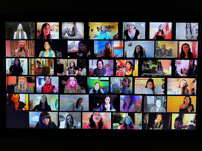 與之有著微妙差異的莫莉·索達《我的歌聲:蕾哈娜<留下>》則選擇了一段固定的旋律作為演唱對象,通過流行音樂愛好者們面對臥室中的攝像頭翻唱這首指定的歌曲,來討論“數字原住民”社會生活與私人生活的界限。索達將演唱者的肖像大量地拼接在一起,形式上仿佛馬賽克般模糊不清,實際上每位參與者投入演唱的面部表情卻又清晰可見。這樣的疊加,也體現了數字生活中以個體參與為模塊進而生成整個產業的現狀。